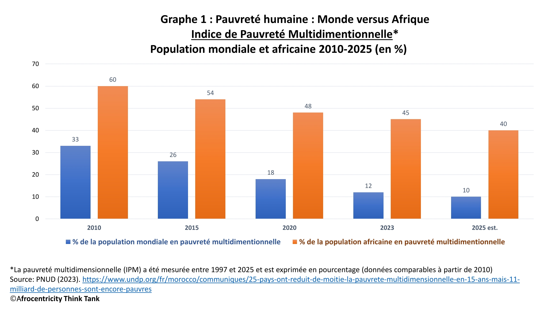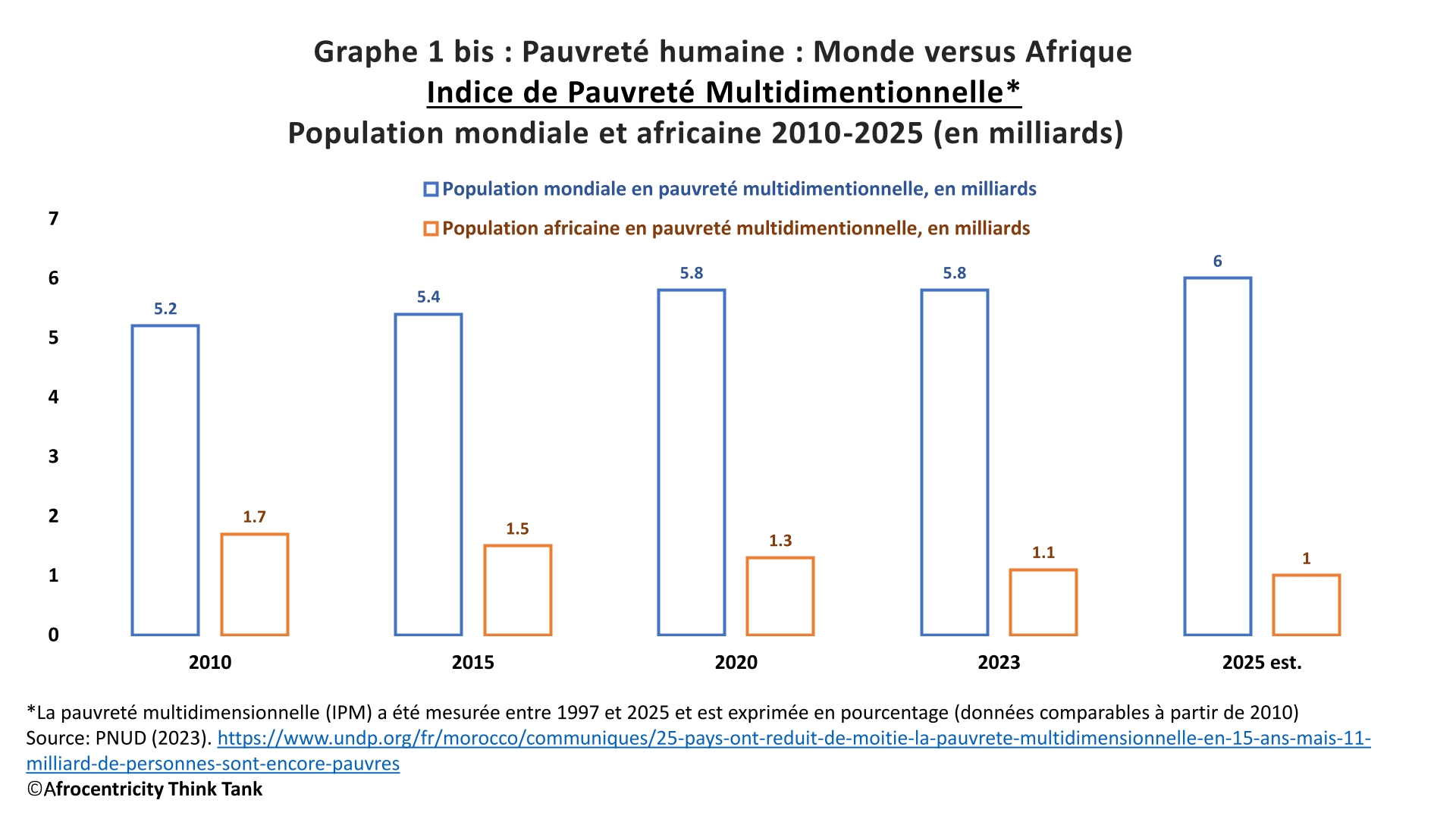 La notion de « déglobalisation asymétrique et sélective » permet de mieux comprendre le contexte dans lequel la croissance économique mondiale n’a pas permis dans les faits d’améliorer substantiellement le « développement humain » au sens des Nations unies. « [C]e développement humain [, selon] une vision holistique du progrès, où le bien-être des personnes est la mesure ultime du succès »,  s’est finalement traduit par une faible dynamique, voire un recul, pour l’atteindre et atteindre les ODD des Nations unies de manière générale. Alors qu’entre 2010 et 2025, le pourcentage de personnes touchées par la pauvreté multidimensionnelle a diminué dans le monde et en Afrique, il ne faut pas oublier que le nombre effectif de la population mondiale est lui aussi en augmentation. La diminution observée au sein de la population africaine doit donc être doublement nuancée, compte tenu des difficultés supplémentaires liées au recensement effectif de la population (voir graphiques 1 et 1bis).